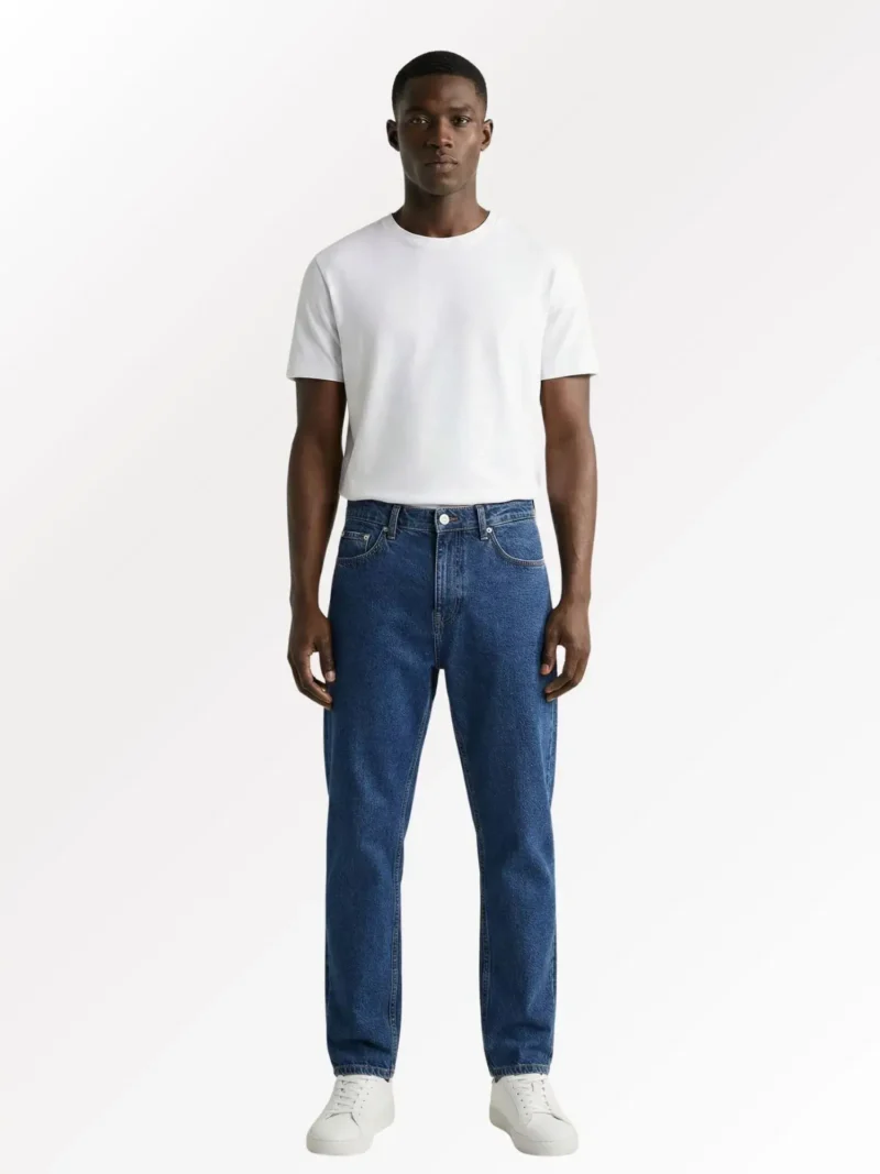 Classic blue carrot fit jeans for men, crafted in durable mid-weight denim with a relaxed thigh and tapered leg. Designed for everyday comfort with a clean, modern silhouette.