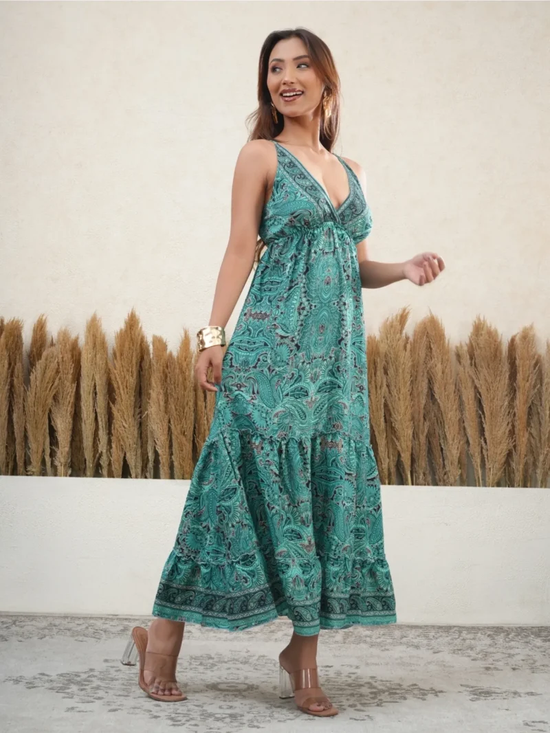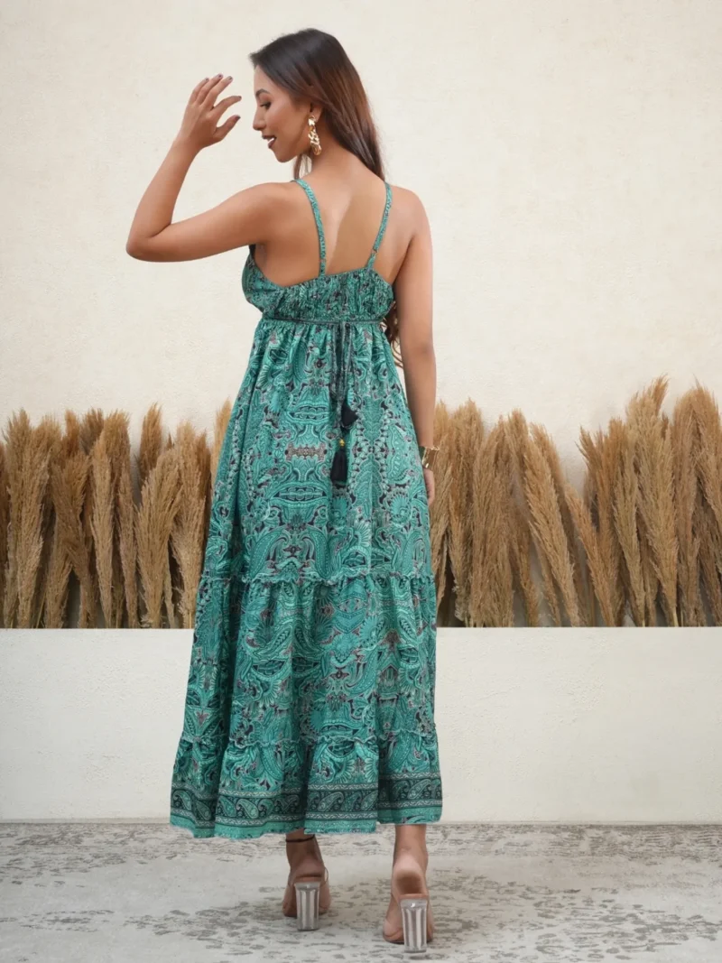 Make a statement with this luxurious Kasturi silk maxi dress, ideal for resort wear and special occasions. Featuring an elegant halter neck and open back design with tie details, this floor-length dress offers a flattering, flowing silhouette. The beautiful Light Green print adds a touch of artistry to the premium silk fabric, while the plunging V-neckline enhances its chic style. Perfect for tropical holidays, destination events, or brunches, the lightweight Kasturi silk ensures comfort and effortless elegance. The adjustable halter ties provide a customized fit, while the open back design adds allure. Pair with delicate jewellery and sandals for a complete resort-ready look. This dress combines timeless elegance with modern flair, making it an essential addition to your occasion wear wardrobe.